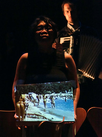 A half-hour opera. Three stories of people who have lost their voice – two of them with aphasia after stroke and one having had a laryngectomy after throat cancer - and are searching for it: Jawad who worked for human rights in Iraq, Sandy a tourist guide, and Spiros a champion swimmer and costume-maker.